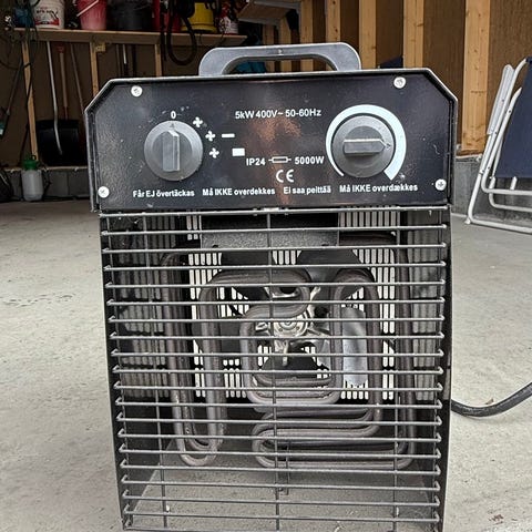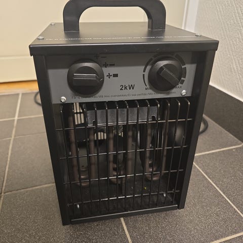 2 kW elektrisk industri vifteovn. Kompakt modell med bærehåndtak på toppen. Frontpanel med dreiehjul for innstilling av effekt og temperatur, samt av/på-funksjon. Gitter i front beskytter varmeelement og vifte. Egnet til oppvarming av mindre rom, garasje, bod eller verksted. Må ikke tildekkes under bruk.