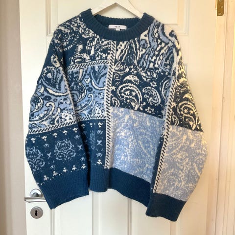 Next genser for dame i størrelse 42. Genseren har flerfargede horisontale striper i ulike nyanser. Materialet består hovedsakelig av akryl, med innslag av nylon, ull, alpakka og elastan. Rund hals og rett passform. Egnet til hverdagsbruk og kan kombineres med både bukser og skjørt. Vaskes på ullprogram etter anvisning på merkelapp.