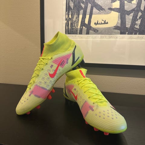 Nike Mercurial Superfly fotballsko i turkis og flerfarget design. Modellen har sokkelignende, høy ankelkrage for tettere passform rundt ankelen. Overdelen er i lett syntetisk materiale med struktur for bedre ballkontroll. Yttersålen har faste knotter tilpasset spill på gressbaner, med en flerfarget, blank finish under. Skoene leveres med Mercurial-sko pose som vist på bildene.