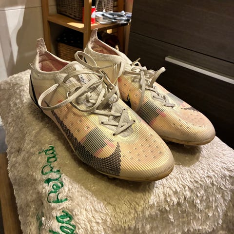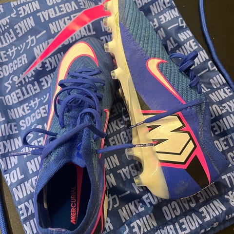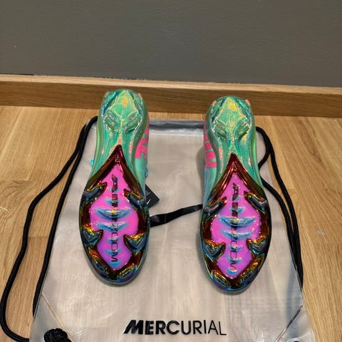 Nike Mercurial fotballsko i gul farge med kontrastdetaljer. Modellen har knottesåle til bruk på naturgress. Skoene leveres med tilhørende Nike-sko pose i matchende design. Skoene er i str 40,5.