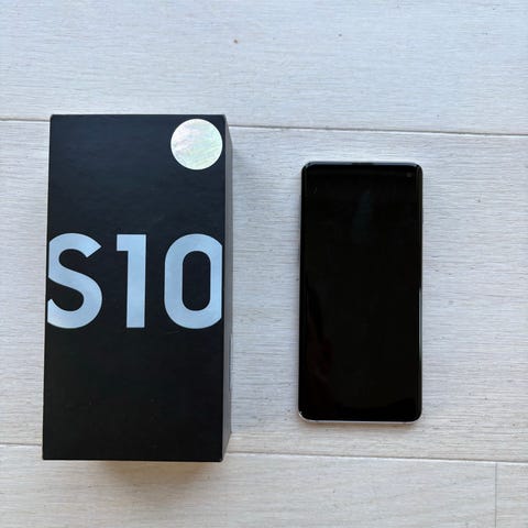 Samsung Galaxy S10+ mobiltelefon med 128 GB lagringsplass. Selger da jeg har fått ny. Batteri og lagring er i flott stand. Skjermen har synlige skader nederst i ett hjørne, se bilder for tilstand. Ellers strøken. Kom gjerne med bud.