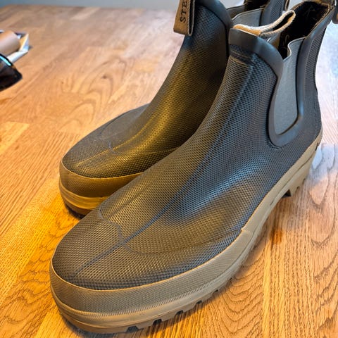 Tretorn regnstøvler i størrelse 41. Kort modell med elastikk i sidene og hempe bak for enklere av- og påkledning, merk hemper på ene støvelen har falt av, utover det er de ellers i meget god stand.