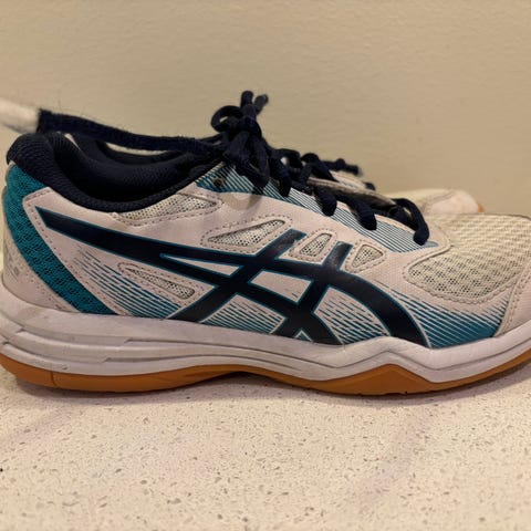 Asics innendørssko i størrelse 38.. Skoene har snøring, syntetisk overdel med pustende meshpartier og mønstret yttersåle i gummi tilpasset innendørs bruk. Egner seg til ulike typer innendørsidrett.