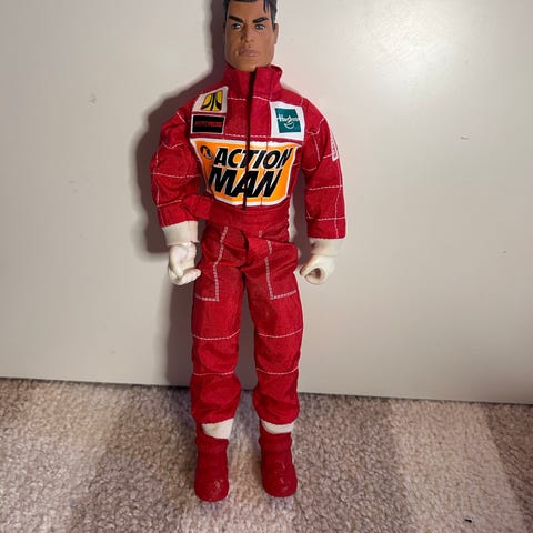 Action Man figur med kort, mørkt hår og skjegg, iført oransje kjeledress med blå glidelås og hvite detaljer på ermene. Dukken har hvit lue og svarte støvler. Egnet som lekedukke eller samleobjekt. Klærne kan tas av og på etter behov.kan sendes men ikke fiks ferdig!