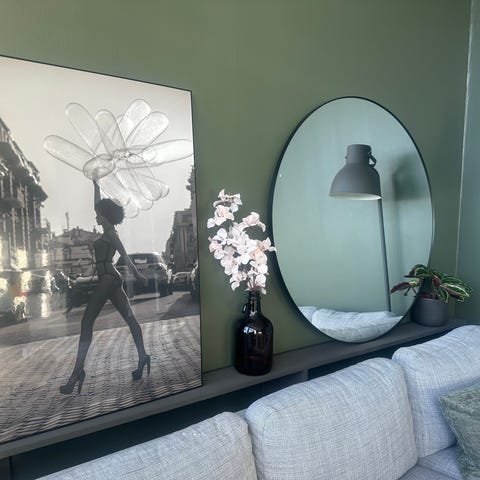 Bohus rundt speil for veggmontering. Speilet har tynn, mørk ramme og rund form. Passer i gang, stue, soverom eller bad, avhengig av behov og plassering. Kan brukes både som praktisk speil og som interiørdetalj.