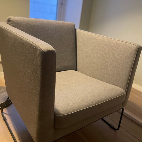 Sett med to lenestoler i svart kunstskinn. Stolene har rette linjer, lave armlener og fast sete- og ryggpute. De står på fire rette ben i samme farge som trekket. Passer til stue, kontor, venterom eller andre oppholdsrom der det er behov for kompakte sitteplasser.