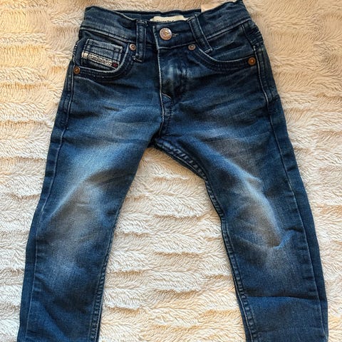 Diesel bukse for gutt i størrelse 18 mnd. Buksen er laget av bomull og er blå. Klassisk 5-lommers modell med knapp og glidelås foran, samt beltehemper i linningen. Egnet som hverdagsbukse for små barn. Strikk og knapp for stille i livet. Se også annet selger har ute for salg