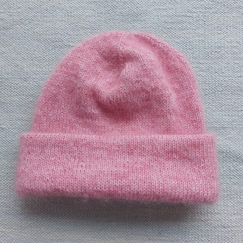 Denne lua er strikket i merinoull og silkmohair.