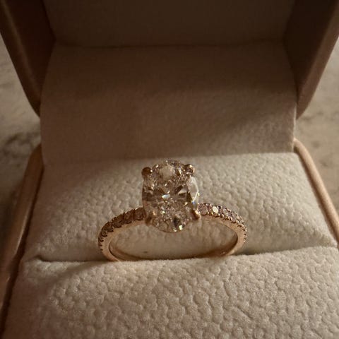 1,09 ct Oval lab diamant ring i hvitt gull (585). Ringen er i str US 6 eller EU 52. Diamanten er 1,09 ct, Oval, farge D, VS1 og excellent cut. Ringen har også små diamanter på siden som er totalt 0,21 ct. Totalt har ringen 1,3 ct av lab diamanter. Det følger med IGI sertifikat på senter diamanten.