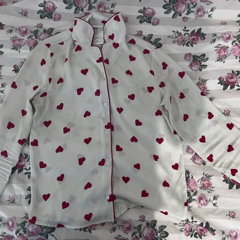 Primark pysjamas for jente i størrelse 152. Sett med langermet overdel i lys farge med motiv på fronten og bukse i brun farge med prikkete mønster. Begge deler er i myk polyester. Egnet som nattøy eller koseklær innendørs.