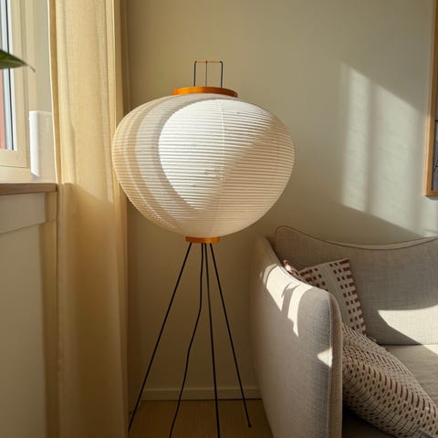 En noe slitt Akari med et lite hull, se bildet. Kjøpt på Vitra. Lyspære følger med.