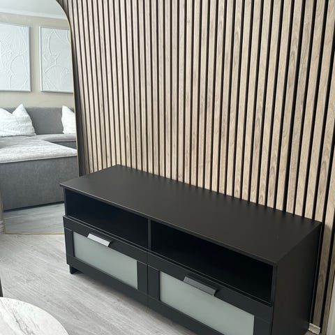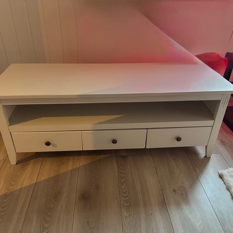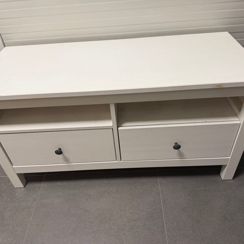 Selger en IKEA HEMNES TV-benk i hvit. Har to skuffer og åpne hyller til oppbevaring. Pent brukt med normale bruksspor.