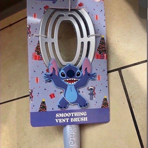 Hårbørsten er en «smoothing vent brush» med motiv av Stitch på skaftet. Børsten har åpne luftkanaler som gjør den egnet til bruk sammen med hårføner.