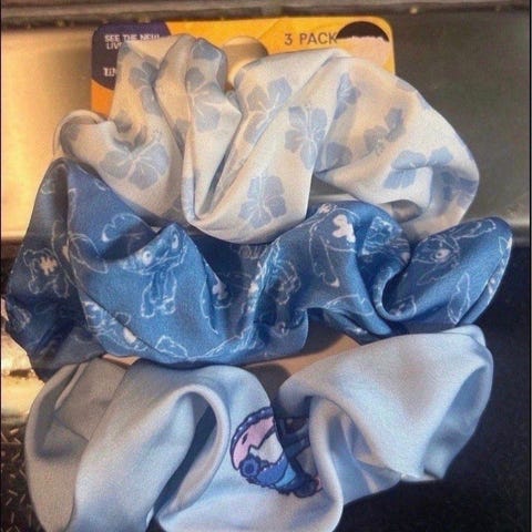 Sett med flere scrunchies i ulike blå nyanser med Lilo & Stitch-motiv. Passer til oppsett av hår i hverdagen eller til tematiserte antrekk.