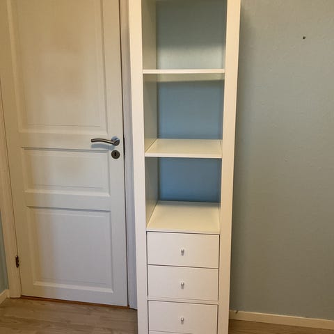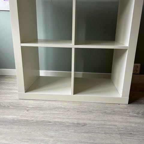 Hvit Kallax hylle fra IKEA, 2x2 med 2 stk beige kurver. Noen bruksmerker, se bilder.