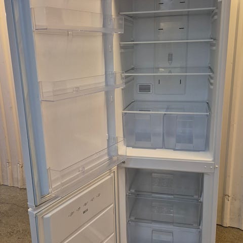 Kombi kjøleskap/fryser. Kjøledelen har flere justerbare glasshyller, grønnsaksskuff og dørhyller for oppbevaring av flasker og mindre varer. Frysedelen nederst har tre gjennomsiktige skuffer som gir oversiktlig lagring av frossenmat.