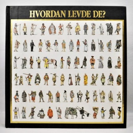 Hvordan levde de? bok som viser historiske personer og klesdrakter fra ulike tidsperioder. Boken inneholder illustrasjoner av mennesker i forskjellige yrker, samfunnslag og kulturer, presentert i ruter på omslaget. Egnet som oppslagsverk eller supplement til undervisning i historie og samfunnsfag.