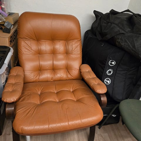 Stolen er stødig og i pent brukt stand. Det er noe normal bruksslitasje/lysere felter i stoffet (typisk “børstemerker”/glans fra bruk – se bilder), men ingen store skader.