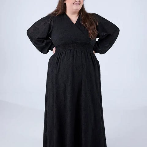 Elegant maxikjole med omslagsoverdel og delikat strukturert blomstertekstur. Kjolen har lange, lett puffede ermer og komfortabel strikk i midjen som gir en feminin og flatterende silhuett. Det myke, fallende stoffet skaper et vakkert uttrykk og god bevegelse.