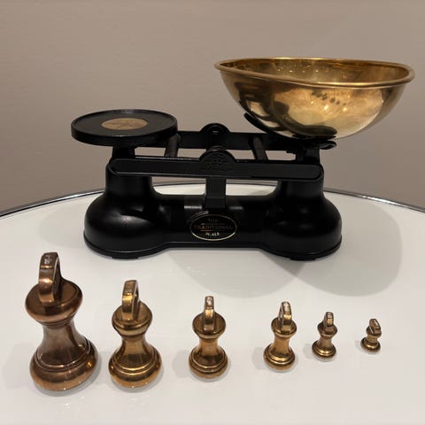 Flott, gammel Salter Modell 250 vekt. Salter er kjent for sin britiske kvalitet og ikoniske design, og denne modellen er et fint eksemplar av gammelt håndverk.