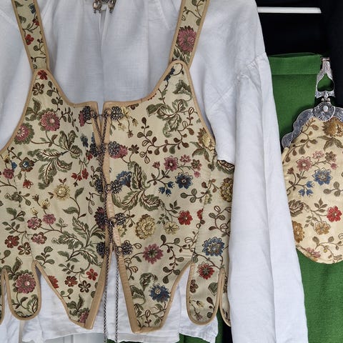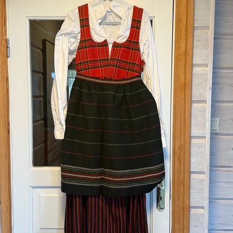 Lite brukt Bærumsbunad til dame i str. 42 med skjorte og 2 ulike forklær, Folklore sko i str. 41 og ullsjal.