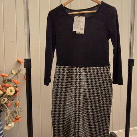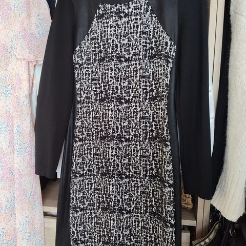 Zara hverdagskjole i størrelse L, men tilsvarer strl S. Kjolen er i svart og hvitt rutemønster med svarte felt langs midje, ermer og hals. Materiale er polyester. Modellen har 3/4-lange ermer og knelengde, egnet som hverdagskjole eller til enkel kontorbruk.