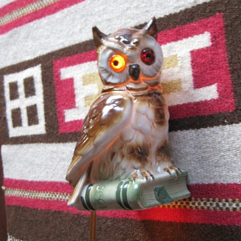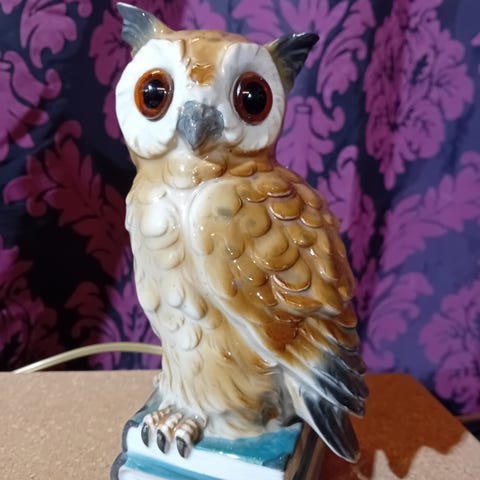 Har ei fin å gammel lysende kattugle for salg , Denne er også for aroma olje med hull bak hodet for påfyll av lukte oljer . Størrelsen på denne er ca 8 x 8 x 16,5 cm ( B x D x H ) Lyspæren inne i ugla kan snues på for forskjellig belysning på ugla . pæresokkelen er E14 .