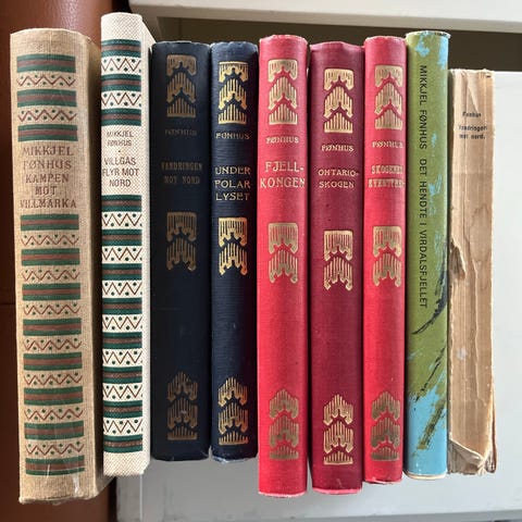 Samling med innbundne bøker av Mikkjel Fønhus. Bøkene har røde permer med gullfarget tekst på ryggen. Flere ulike titler er inkludert i samlingen, som blant annet romaner og fortellinger fra norsk natur- og villmarksmiljø. Egner seg for lesere som ønsker et samlet utvalg av Fønhus’ forfatterskap i innbundet utgave.