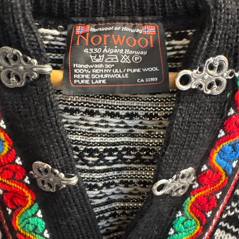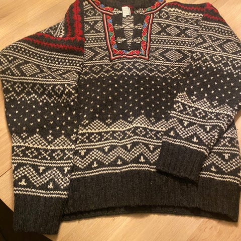 Nordbay ullgenser for herre i størrelse L. Genseren er grå med tradisjonelt mønster i hvitt og detaljer i rødt, grønt, blått og gult rundt halsåpningen. Den har åpen hals med metallhekter foran og ribbestrikkede kanter på ermer og nederkant. Materialet er ull, som gir god isolasjon og egner seg til hverdagsbruk eller som varm genser på kalde dager.