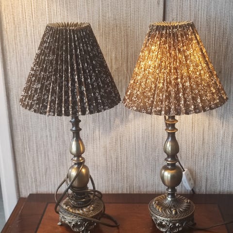 Bord og -/ eller Gulvlamper i messing med dekorativt utskåret fot og stamme i gullfarget barokk utførelse. Lampene har høy, slank form med flere ornamenterte partier langs stangen og rund, profilert fot som gir stabilitet.