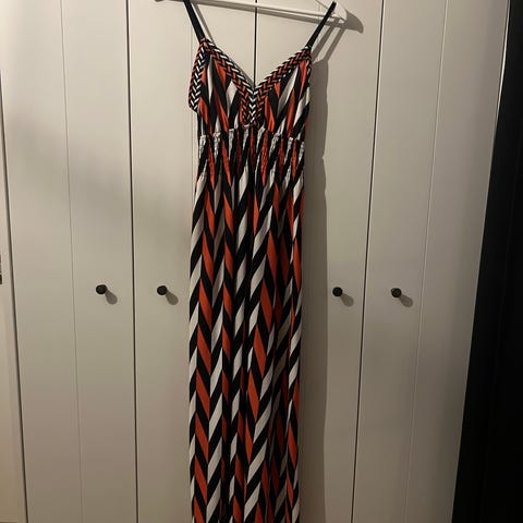 Lang og elegant kjole i varm oransje farge. Kjolen har lange ermer med dekorative detaljer, elastisk midje som gir fin passform, og belte som kan knytes. Mykt og behagelig stoff. Passer både til hverdagsbruk og spesielle anledninger. Pent brukt og i god stand.