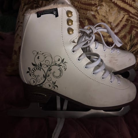 Kunstløpskøyter i størrelse 38 . Klassisk hvit modell med snøring foran og hæl i kontrastfarge. Skøytene har fastmonterte stålskinner til bruk på is. Egnet til generell kunstløpstrening og lek på isen.