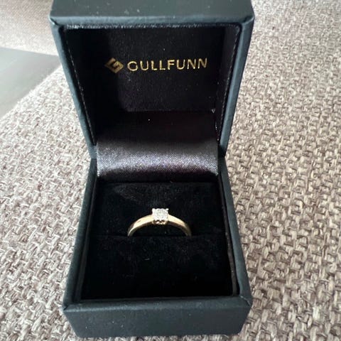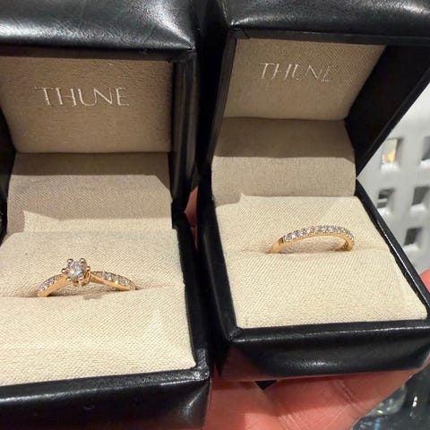 Giftering og forlovelsesring fra Thune for dame i 14k gull med diamanter. Størrelse 51/52