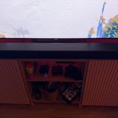 Samsung hjemmmekinoanlegg selges grunnet flytting. Det følger med 1 lydplanke, 1 subwoofer og 2 høytalere. Følger ikke med egen fjernkontroll, men selv bruker vi kontrollen til TV og/eller Apple TV kontrollen for å styre lyden.