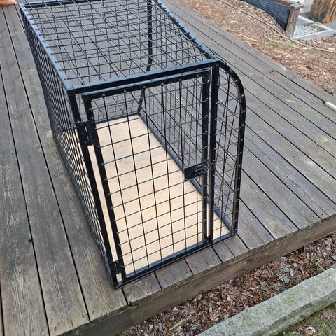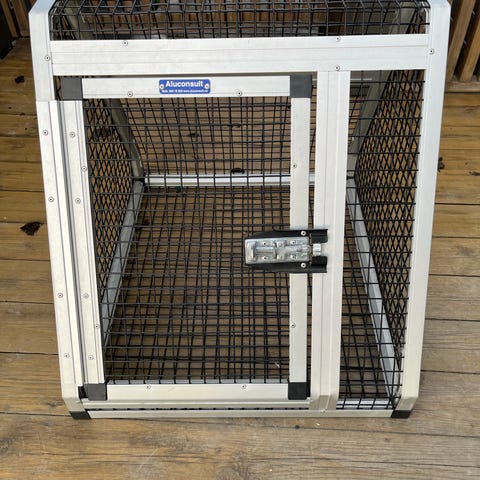Bilbur hundebur i metall i svart farge. Bur med skrå sider tilpasset plassering i bilbagasjerom. Gitterkonstruksjon gir god lufting og oversikt for hunden. Egnet til transport og sikring av hund under bilkjøring. Solid bunnplate i 9 mm furufinér. Buret har blitt brukt av en stor hann Gordon setter.