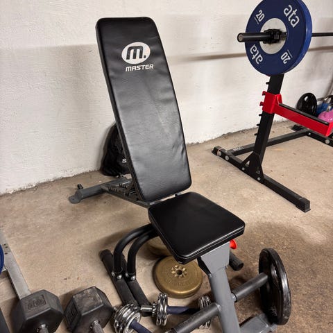 Med benken følger justerbare manualer som kan tilpasses fra 2,5 kg opptil 24 kg. Manualene er i svært god stand og ser nesten nye ut. De er enkle å bruke og svært praktiske, siden du enkelt kan justere ønsket vekt – alt samlet på ett sted.