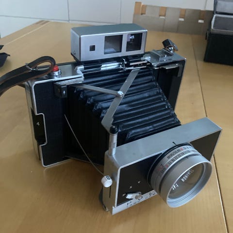 Kameraet er et klassisk sammenleggbart Polaroid Land Camera med belgsystem.