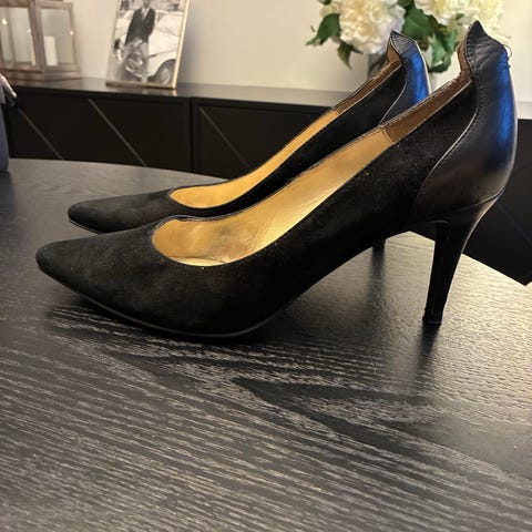 Dette er mørke grå, høyhælte pumps i semsket skinn.