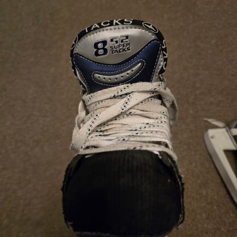 CCM Tacks XF50 ishockeyskøyter i barnestørrelse 36. Skøytene har svart overdel med hvite lisser og polstret pløse for støtte og komfort rundt vristen. Hælkappe og ankelparti er forsterket for bedre stabilitet på isen. Leveres med faste stålskinner egnet til ishockeybruk for barn.