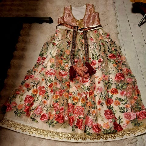 Blå festdrakt syes på bestilling.