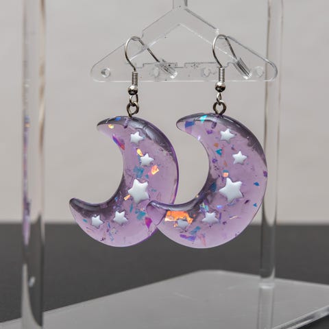 Håndlaget måneformet brosje i rosa nyanser. Brosjen er dekorert med små perler og steiner i rosa og blå, samt en dråpeformet stein på midten. Nederst henger det tynne kjeder som ekstra detalj. Passer som tilbehør på jakke, genser, kjole eller veske.