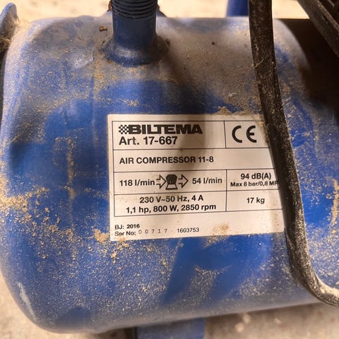 Bosch SV/DTA 150B ensylindret stillegående kompressor for trykkluft. Enheten har reimdrevet kompressoraggregat og elektrisk motor montert på volumrik horisontal trykktank. Den er nå koblet for 1-fase med ledning og støpsel, men kan kobles som 3-fase. Begynte livet som kompressor på tannlegekontor og ble senere benyttet på mekanisk verksted. Fin der stor tank og lav støy er viktig!