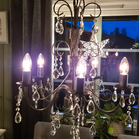 Lysekrone fra bohus. Krom. 9 armer. Mangler ett par dråper til pynt, men er ikke av betydning for utseende. Disse kan også enkelt kjøpes på f eks lampehuset.