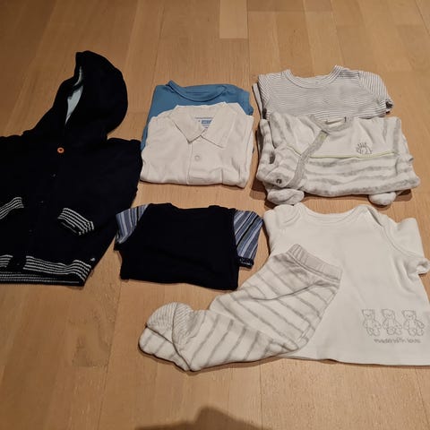 Fint brukte (noen godt brukte) babyklær i str. 56. Mesteparten fra H&M, Reflex, NEXT. Fortsatt fine og brukbare! Mener at alt er fritt for flekker, men har ikke sjekket nøye etter.