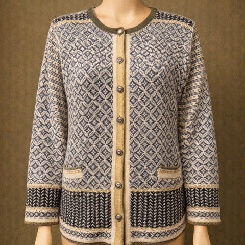 Behagelig causual comfy komfortabel kvalitet elegant stilfull rimelig mote merkeklær bærekraftig gjenbruk secondhand norsk kofte, håndstrikket ull, 100% ull, made in norway, hustvedt arendal, tradisjonsstrikk, ulljakke dame, vinterkofte, L XL