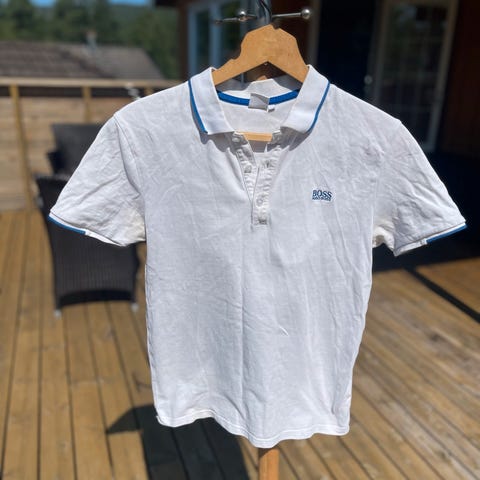 Hugo Boss pique t-skjorte for herre i størrelse S. T-skjorten er svart og laget av bomull. Modellen har krage med knappestolpe og kort erm. Diskré Hugo Boss-logo på brystet. Passer til hverdagsbruk og enkle, pene antrekk.