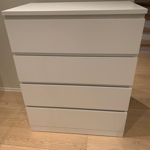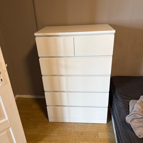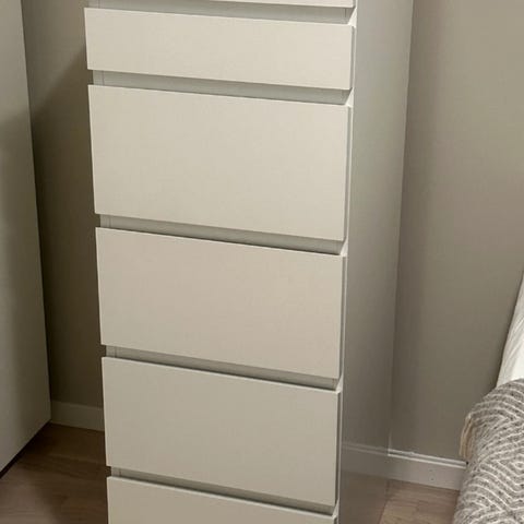 IKEA smal kommode med flere skuffer i hvit utførelse. Kommoden har en høy og slank form med flere like store skuffer som gir god oppbevaringsplass til klær, tilbehør eller småting. Øverste del har lokk som kan åpnes, med speil på innsiden og et rom for oppbevaring. Passer for bruk på soverom, gang eller andre rom der det er behov for kompakt oppbevaring.