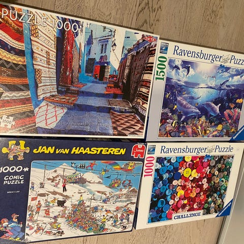 Ravensburger puslespill sett med 4 ulike puslespill. Hvert puslespill har 500 brikker. Motivene inkluderer blant annet landskap, bymiljø og dyr. Egnet for ungdom og voksne som liker puslespill med middels vanskelighetsgrad. Selges samlet