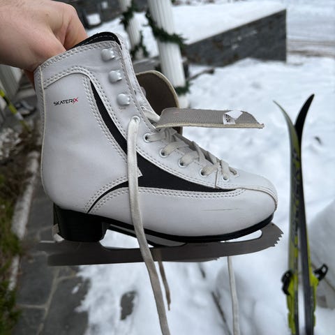 kunstskøyter for barn i størrelse 34. Klassisk hvit modell med snøring og dekorative snøkrystaller på siden. Skøytene har sort hæl og metallskinne med tagger foran, egnet til vanlig skøytebruk på isbaner. Passer til barn som trenger skøyter i størrelse 34.