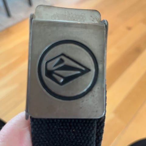 Volcom belte for herre i brun farge med metallspenne. Beltet har en rektangulær spenne i antikkmessing-look med Volcom-logo i front. Passer til hverdagsbruk og kan brukes til både olabukser og chinos. Materiale ser ut som imitert skinn eller behandlet lær. Lengde 110 cm og bredde 35 cm. Følger med to beltespenner som kan brukes på tøybelter: Billabong og Volcom.